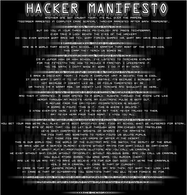 Si tratta di un altro pezzo fondamentale della cultura hacker, preso in prestito da tutti gli hacker, vecchi e nuovi e che rappresenta una descrizione scritta della filosofia hacker che la raffigura sia dal punto di vista ideologico, psicologico che sociale.