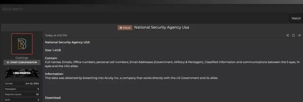 In a further post, the same actor claimed to have breached the data of the National Security Agency (NSA) of the United States. According to the report, the size of the compromised file is 1.4 GB and contains full names, emails, office phone numbers, personal cell phone numbers, government, military, and Pentagon email addresses. Additionally, the data is said to include classified information and communications between the “5 Eyes,” “14 Eyes,” and the US allies. This breach allegedly occurred by infiltrating the systems of Acuity Inc., a company that works directly with the US government and its allies.