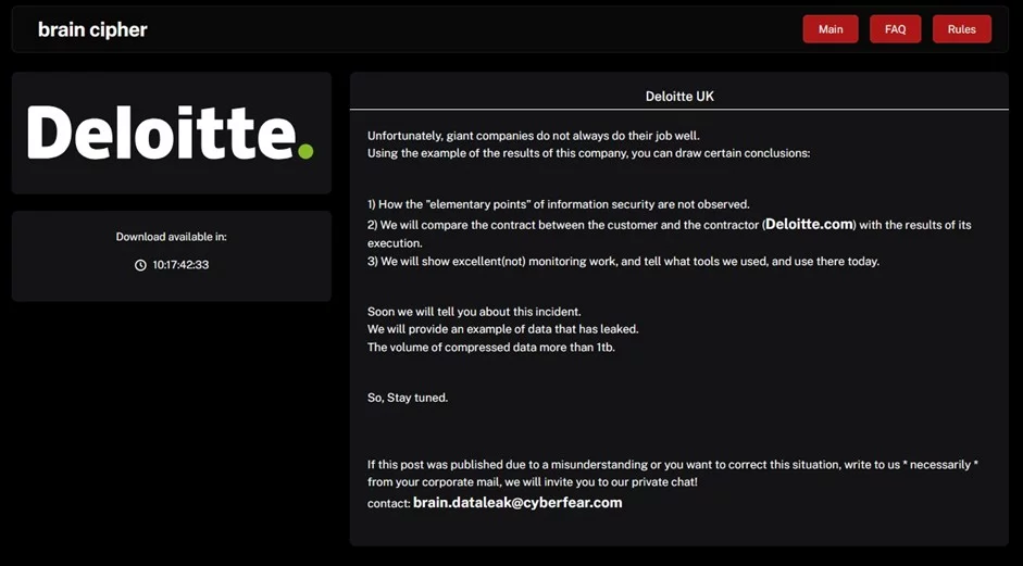 At 14:35 today, the claim of a cyber attack on the consulting giant Deloitte was detected on BrainChiper’s Data Leak Site. A countdown is active, marking the time for the publication of the data, which according to the cybercriminals will take place in 10 days and 20 hours.