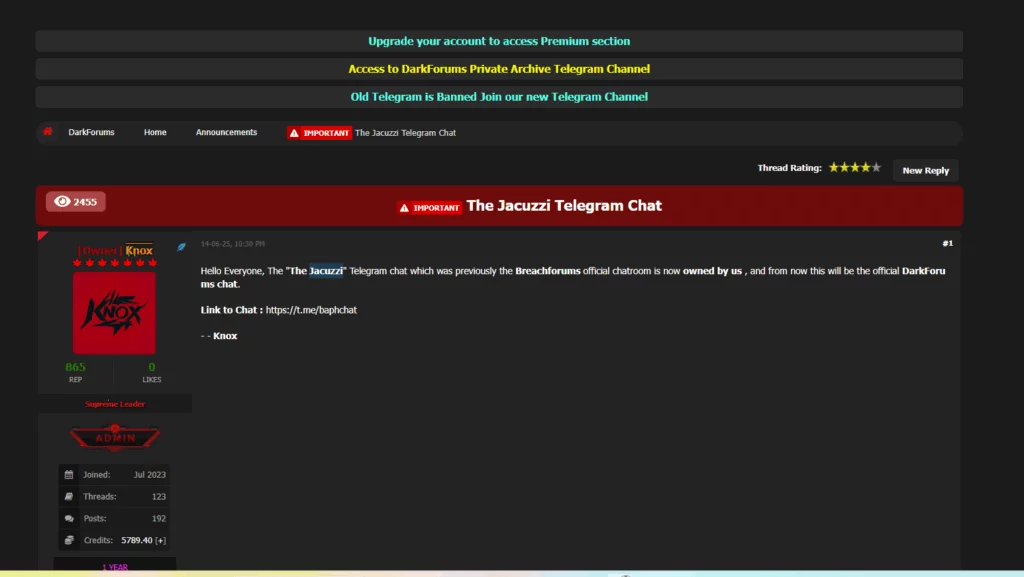 The underground landscape of cybercriminal forums continues to evolve and is changing. With an official announcement published on June 25, 2025 both on Telegram and within the DarkForums forum, the user Knox – current administrator and top figure of the platform – has communicated the transfer of control of the Telegram channel “The Jacuzzi”, also known as baphchat, under the aegis of DarkForums.