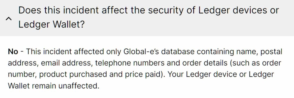 Ledger emphasizes that affected users will receive a separate message from Global-e with details on the impact of the incident . For further information, the company recommends contacting Global-e, as the breach occurred on the payment partner’s side.