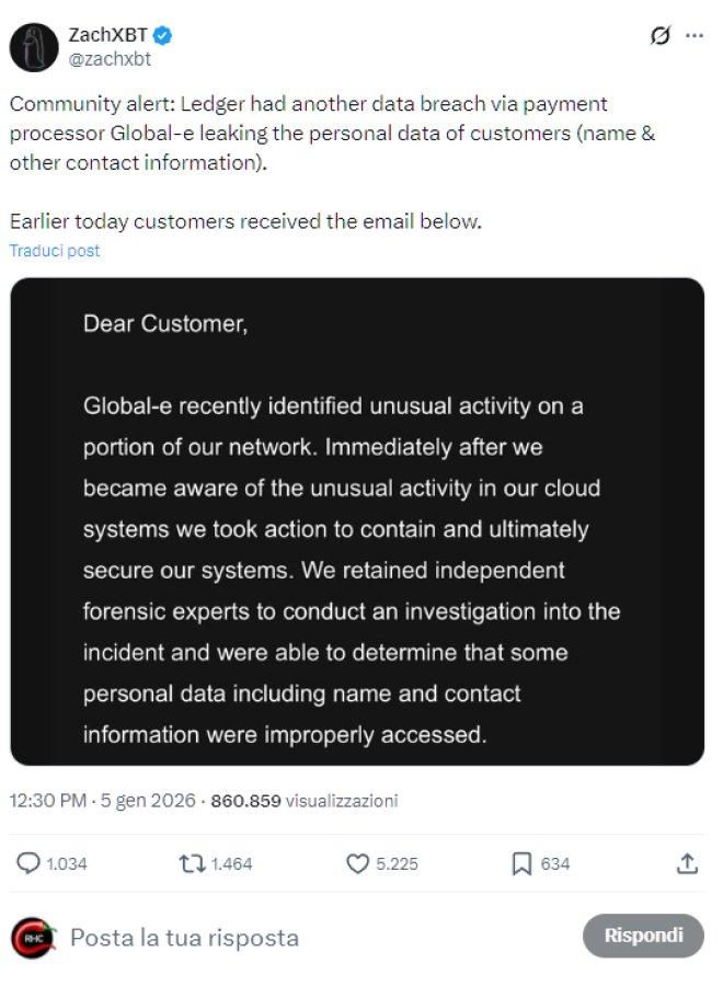 The situation became public knowledge after researcher ZachXBT issued a community alert and shared an email notification about the incident. It’s important to note that this notification was sent to Global-e, not Ledger.