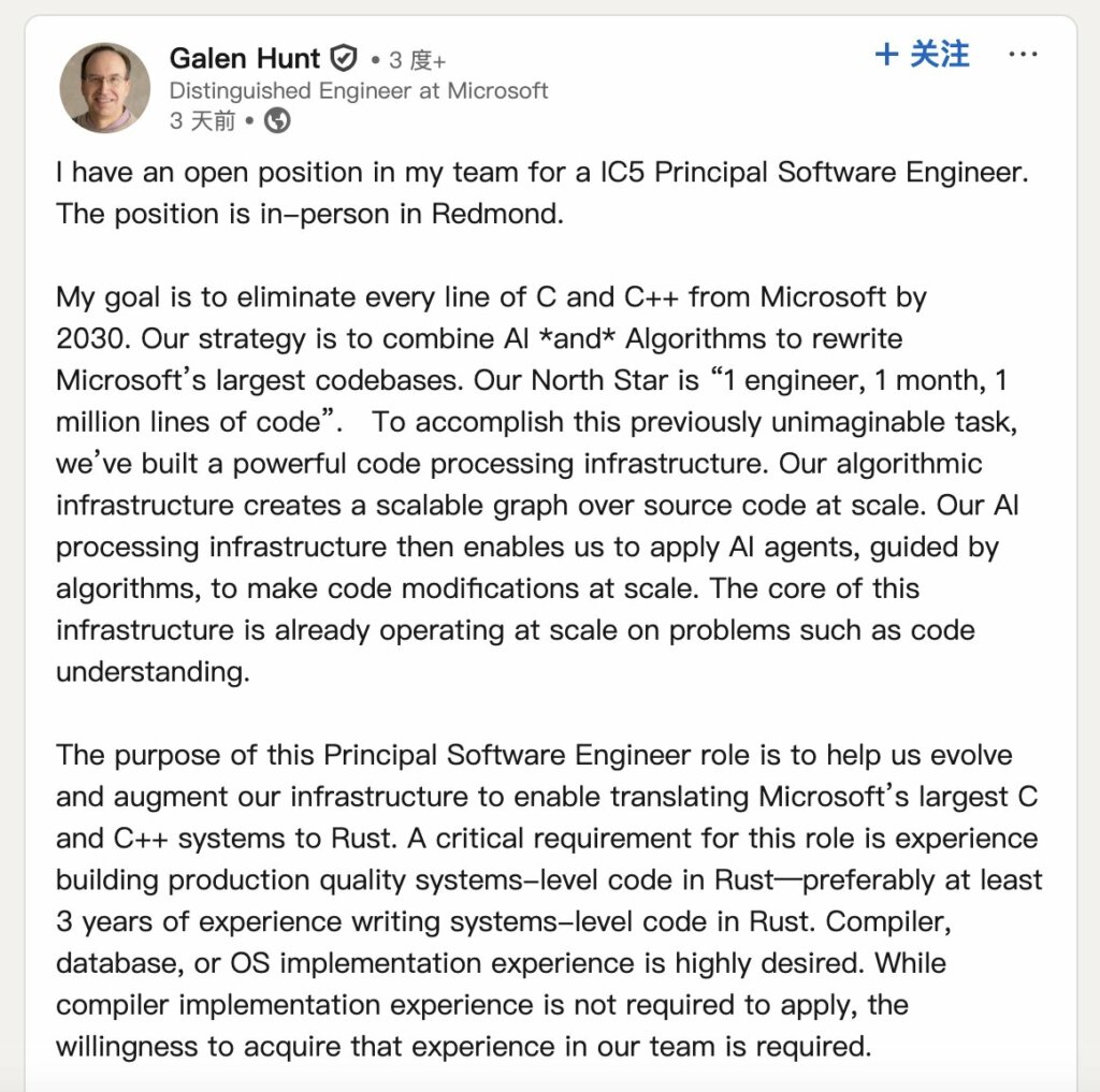 In his LinkedIn post, Hunt summarizes his vision as follows: the complete elimination of every line of C and C++ code from Microsoft repositories by the end of the decade.