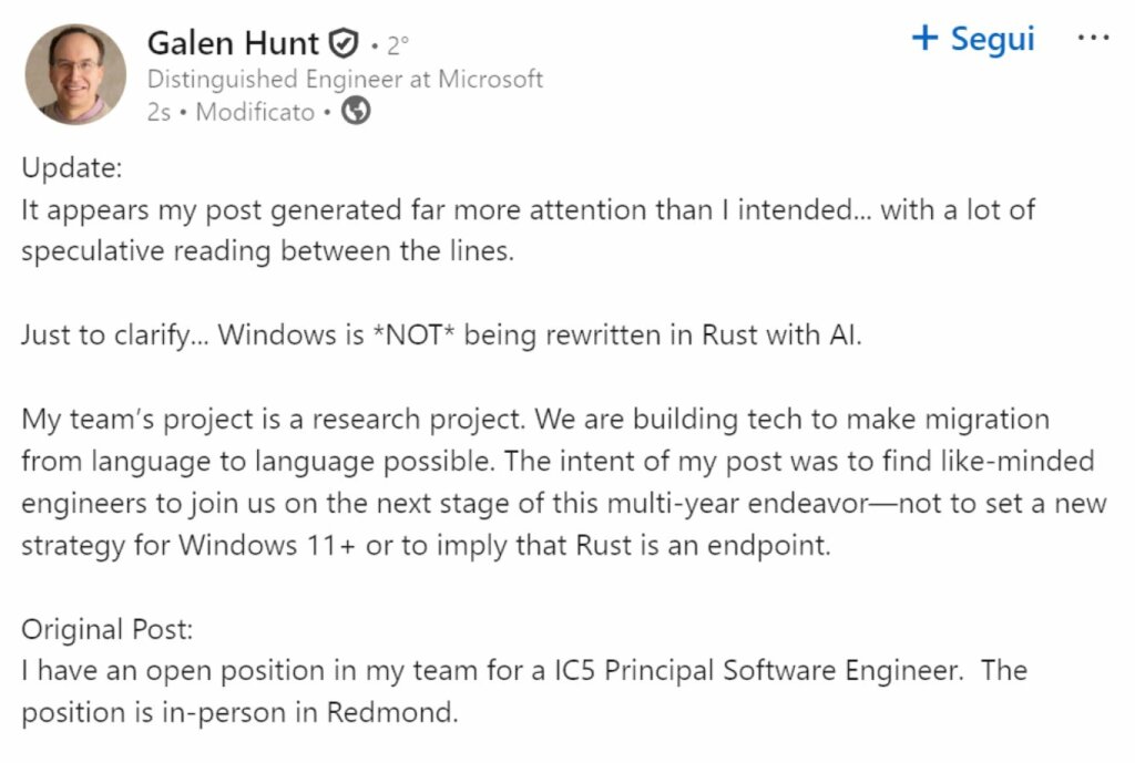Galen Hunt’s subsequent correction significantly revised his initial interpretation of his post, clarifying that Windows is not being rewritten in Rust using AI , and that his team’s project is part of research and experimentation , not part of an official new strategy for Windows 11 or Microsoft’s core products.