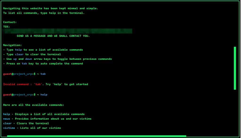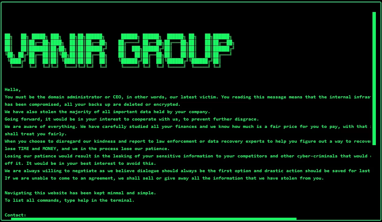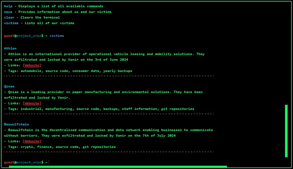 The Vanir Group’s website also includes an interactive terminal where commands like “help” for a list of available commands, “news” for information about the group and their victims, and “victims” for a list of all their victims can be entered.