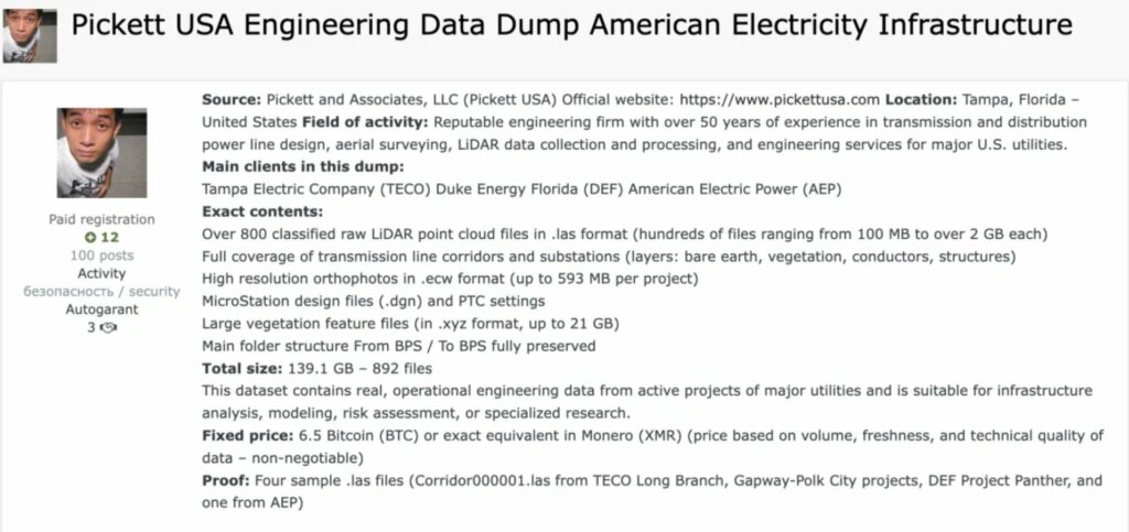 The hacker claims the data concerns projects from Tampa Electric Company, Duke Energy Florida, and American Electric Power. The text also cites the size of these companies: Tampa Electric serves approximately 860,000 customers in west-central Florida, Duke Energy Florida serves approximately 2 million customers statewide, and American Electric Power serves nearly 5.6 million customers in 11 states. A representative for Pickett USA declined to comment in response to requests from reporters. The energy companies, according to the source, also did not respond to requests.