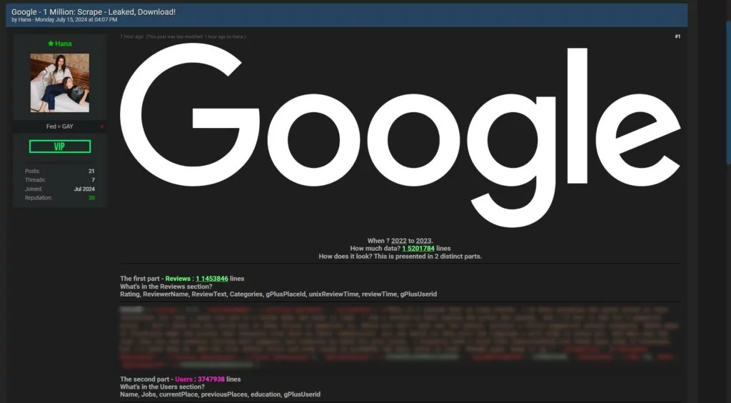 Recently, a threat actor claimed to have publicly released one million records scraped from Google, raising significant alarm regarding personal data security. The information appeared on an online forum in a post dated July 15, 2024. User “Hana” published a thread titled “Google – 1 Million Scrape – Leaked, Download!” providing details about this alleged data breach.