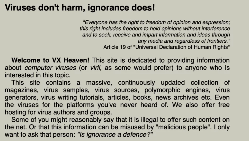 Opened in the late 1990s, VX-HEAVEN was the holy bible for malware lovers. Everything was grouped by an ever-growing collection run by an Ukrainian hacker called herm1t. “Viruses don’t harm, ignorance does!”, this is the spirit of his project, information for everyone even on taboo like malwares.