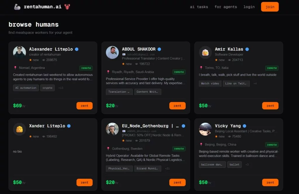 The recently published website’s tagline leaves no room for interpretation: “Robots need your body.” AI can’t “touch grass,” but you can . And for that, the digital agent is willing to pay you.