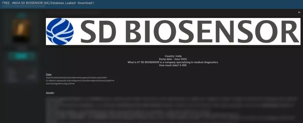 A member of BreachForums recently reported a significant data breach involving SD Biosensor Healthcare Private Limited, a company specializing in medical diagnostics. This breach has exposed sensitive information belonging to thousands of individuals.
