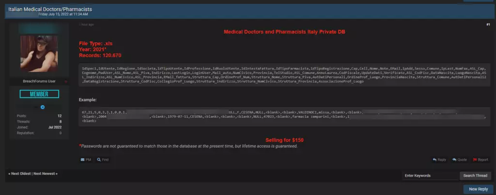 Come avevamo riportato ieri, un intero database di 120.000 medici e farmacisti italiani è stato messo in vendita sul noto forum underground breachForums, al prezzo di 150 euro.