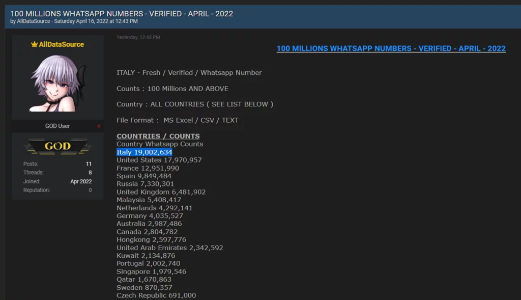 Nello specifico, ecco che sul nuovo forum si iniziano a vedere offerte di informazioni in vendita, come nello specifico 100 milioni di numeri di telefono associati a persone provenienti dalla nota APP di messaggistica whatsapp.