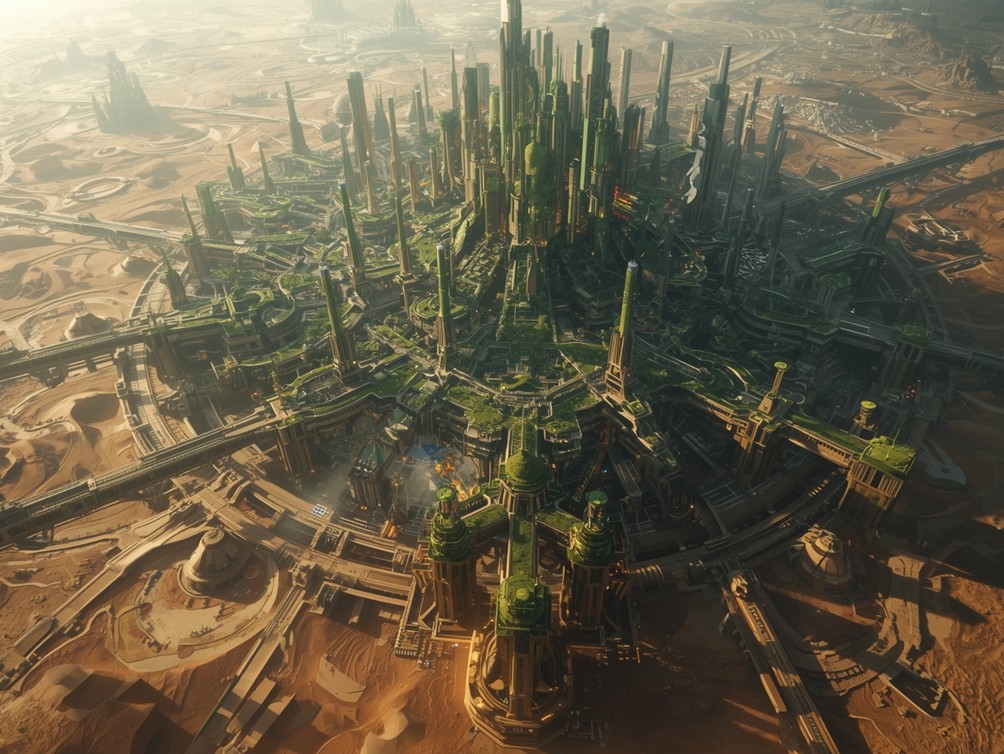 Ogni quartiere è un ecosistema vivente e sostenibile: ponti sospesi tra torri verdi, strade luminose alimentate da energia pulita, e droni che pattugliano il cielo come custodi silenziosi. Qui la vita pulsa al ritmo dei dati, senza dimenticare quel pezzo di GAIA sul quale è posata la città che sembra respirare, un organismo urbano fatto di luce e di codice, in perenne armonia.