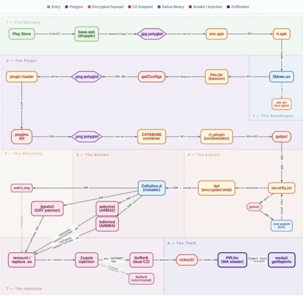 Durante la fase di post-sfruttamento, il codice dannoso viene iniettato in ogni app avviata sul dispositivo. Tuttavia, l’obiettivo principale degli aggressori è WhatsApp. All’avvio dell’applicazione di messaggistica, il malware estrae database crittografati, chiavi del protocollo Signal, numeri di telefono e dati di backup di Google Drive. Tutte queste informazioni vengono inviate al server di comando e controllo, consentendo agli operatori del malware di clonare la sessione WhatsApp della vittima sul suo dispositivo.