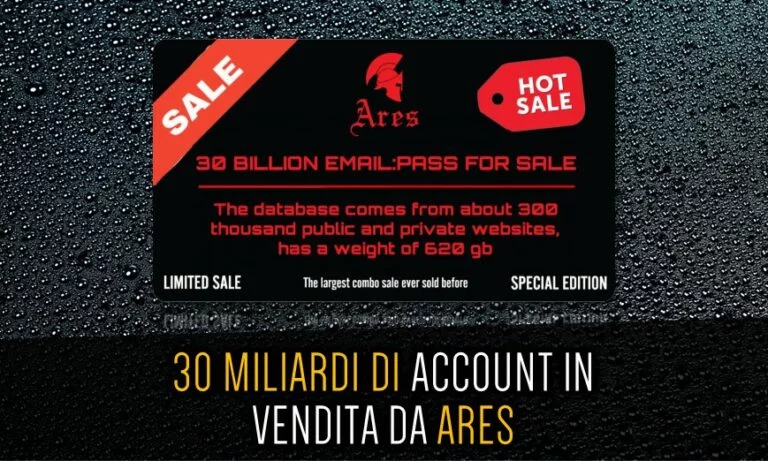 Si avete letto bene. Con un post del 4 dicembre scorso sul suo canale privato di Telegram, il gruppo di criminali informatici di ARES mette in vendita 30 miliardi di account e password precedentemente violati.