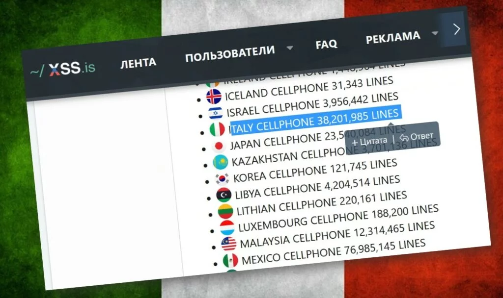 Un nuovo annuncio comparso sul forum underground XSS in lingua russa, accessibile su presentazione nella sua versione onion, ha destato particolare preoccupazione all’interno della comunità della sicurezza informatica. Nel post, i ricercatori di DarkLab, hanno rilevato la vendita di un enorme database contenente oltre 38 milioni di numeri di telefono di cittadini italiani, con un prezzo fissato a diverse migliaia di dollari.