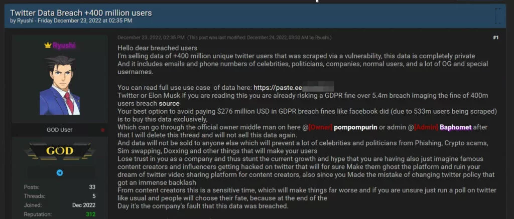 “Twitter o Elon Musk, se stai leggendo questo messaggio, sei già a rischio di essere multato dal GDPR per 5,4 milioni di dollari, implicando una multa per violazione dei dati di 400 milioni di utenti. Il modo migliore per evitare di pagare una multa di 276 milioni di dollari è acquistare questi dati”,