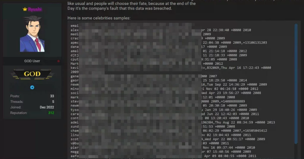 Il venditore ha fornito un campione di 1.000 account come prova dell’autenticità del database, che include informazioni personali di personaggi famosi come Donald Trump Jr., Vitaly Buterin, Brian Krebs e altri.