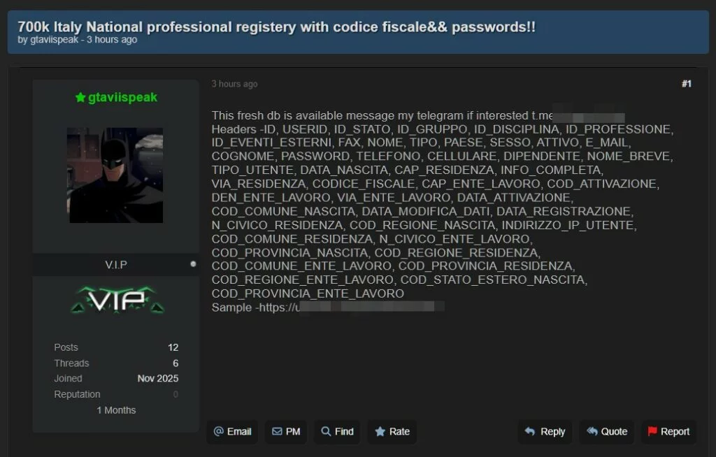 Un nuovo allarme arriva dal sottobosco del cybercrime arriva poche ore fa. A segnalarlo l’azienda ParagonSec, società specializzata nel monitoraggio delle attività delle cyber gang e dei marketplace clandestini, che ha riportato la comparsa su un forum underground di un presunto database contenente oltre 700.000 record appartenenti ad un Registro Professionale Italiano non meglio precisato.