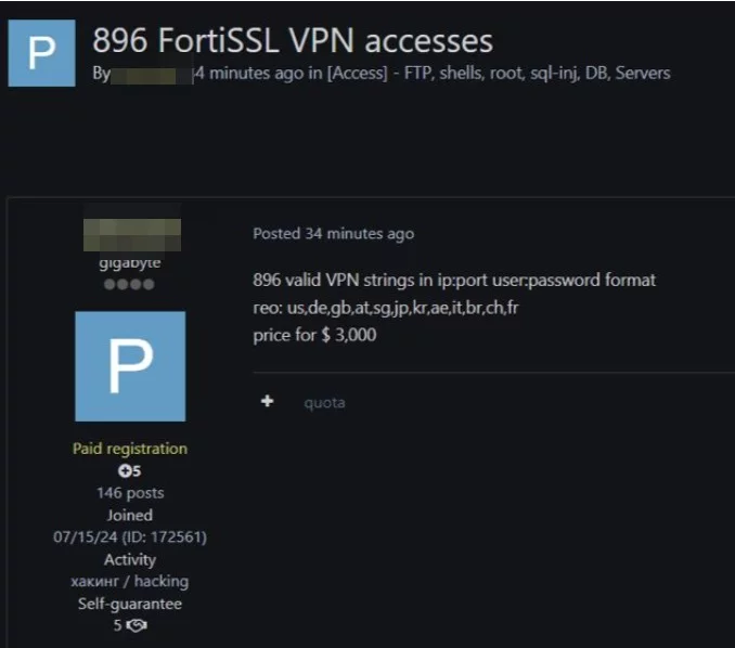 Negli angoli più nascosti di internet, il traffico di dati rubati e accessi non autorizzati continua a prosperare. Un recente post apparso su un forum underground chiuso, mostra la vendita di 896 credenziali VPN FortiSSL, complete di indirizzo IP e credenziali in chiaro, a un prezzo complessivo di 3.000 dollari.