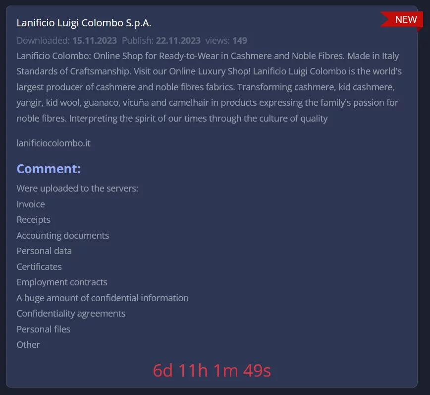 La banda di criminali informatici di 8Base (che abbiamo intervistato qualche tempo fa), rivendica un attacco informatico all’azienda italiana Lanificio Luigi Colombo, come riportato nel suo Data Leak Site (DLS).