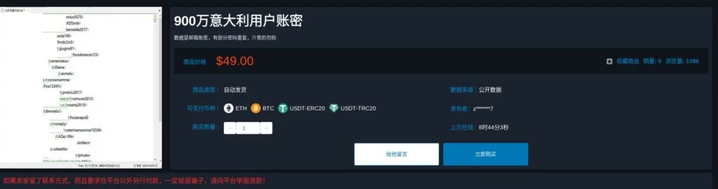 All’interno del market è presente un annuncio, datato 31-12-2023, tramite il quale è possibile acquistare 900.000 dati di account italiani, vediamo l’annuncio ed il relativo screen: