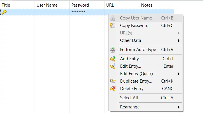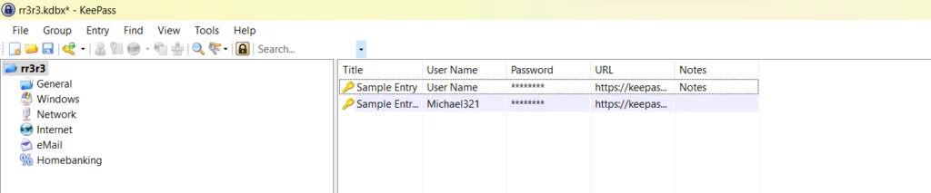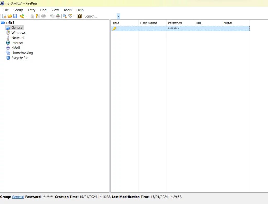 Schermata di KeePass, un password manager che consente di salvare le proprie password suddividendole per categorie, queste che vediamo nello screen sono quelle di default ma ovviamente è possibile crearne delle altre così da organizzare al meglio le proprie password, andiamo a creare una entry con una password: