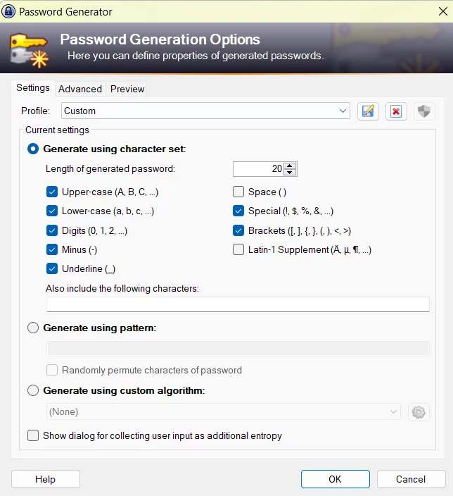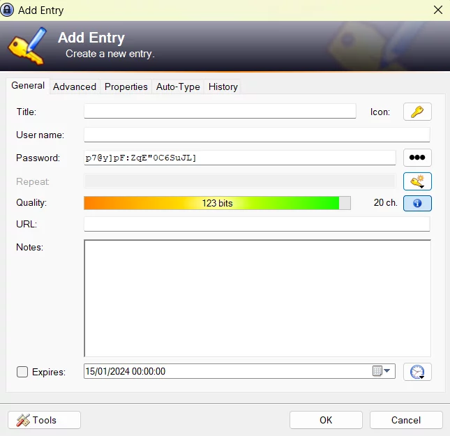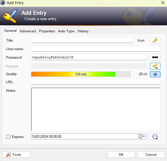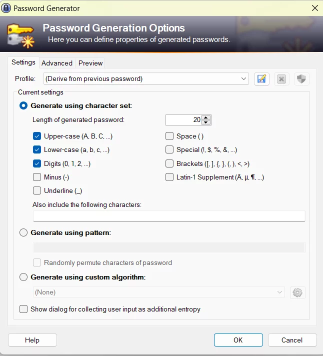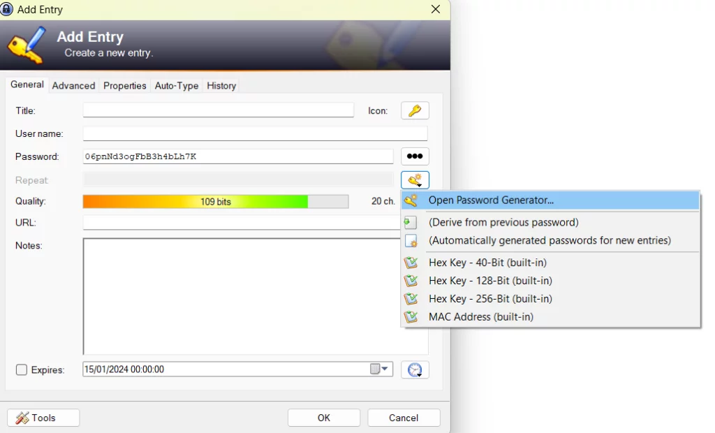 Questa è la schermata che ci apparirà quando andremo a creare la entry che ci interessa, ovviamente ho reso la password visibile(con le impostazioni di default che dopo modificheremo) per darvi un’idea di quello di cui stiamo parlando, la password che Keepass genera di default è una password ovviamente alfanumerica di 20 caratteri(quindi nulla a che vedere con le password che abbiamo visto sopra), ora però divertiamoci un po’ a modificare le impostazioni del “password generator” cliccando sulla chiave sotto ai tre puntini ed andando ad impostare la password da generare con i criteri che vogliamo: