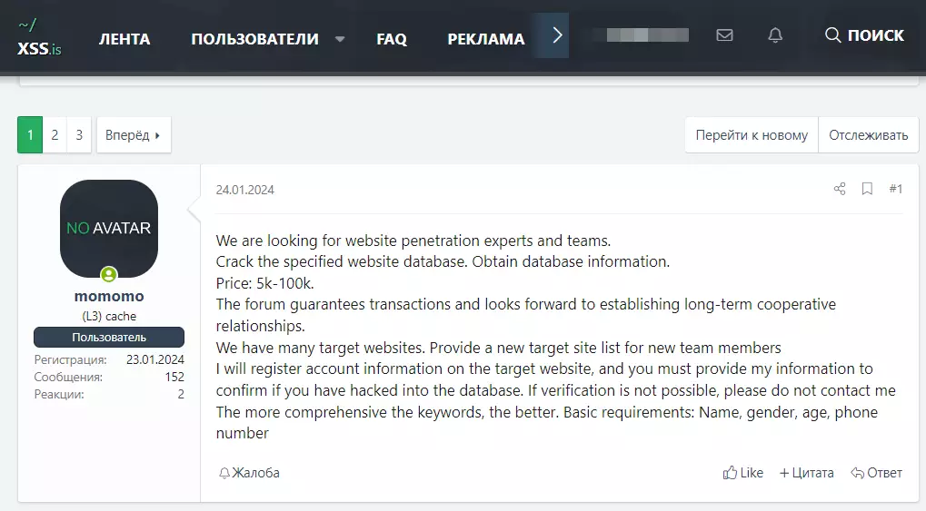 Il testo dell’annuncio è esplicito: “Cerchiamo esperti e team di penetrazione dei siti web. Crackare il database del sito web specificato. Ottenere informazioni dal database. Prezzo: 5k-100k. Il forum garantisce le transazioni e auspica di stabilire rapporti di cooperazione a lungo termine. Abbiamo molti siti web target. Fornisci un nuovo elenco di siti di destinazione per i nuovi membri del team. Registrerò le informazioni dell’account sul sito Web di destinazione e dovrai fornire le mie informazioni per confermare se hai violato il database. Se la verifica non è possibile, non contattarmi. Più le parole chiave sono complete, meglio è. Requisiti di base: nome, sesso, età, numero di telefono.”
