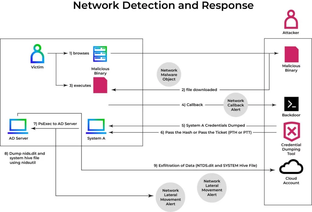Gli aggressori, riporta la ricerca di Trellix, dopo aver acquisito privilegi amministrativi su un host, sfruttano spesso strumenti nativi (ad esempio vssadmin) per creare Volume Shadow Copy e aggirare i lock sui file, copiando così NTDS.dit senza interrompere i processi AD. Successivamente riparano il file con esentutl e ricavano credenziali con utilità come SecretsDump, Mimikatz o anche con semplici comandi di copia. Queste operazioni possono risultare sorprendentemente silenziose per molte difese tradizionali, motivo per cui il rilevamento basato sul comportamento di rete è fondamentale.