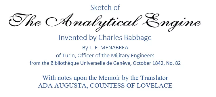Babbage visitò Torino nel 1840 per partecipare, presso l’Accademia delle Scienze, al secondo Congresso degli scienziati italiani. Discusse le sue idee con matematici italiani, tra cui Luigi Menabrea. Durante la visita di Babbage, Menabrea raccolse tutto il materiale necessario per descrivere la macchina analitica e lo pubblicò nell’ottobre 1842 in Francia in lingua francese.