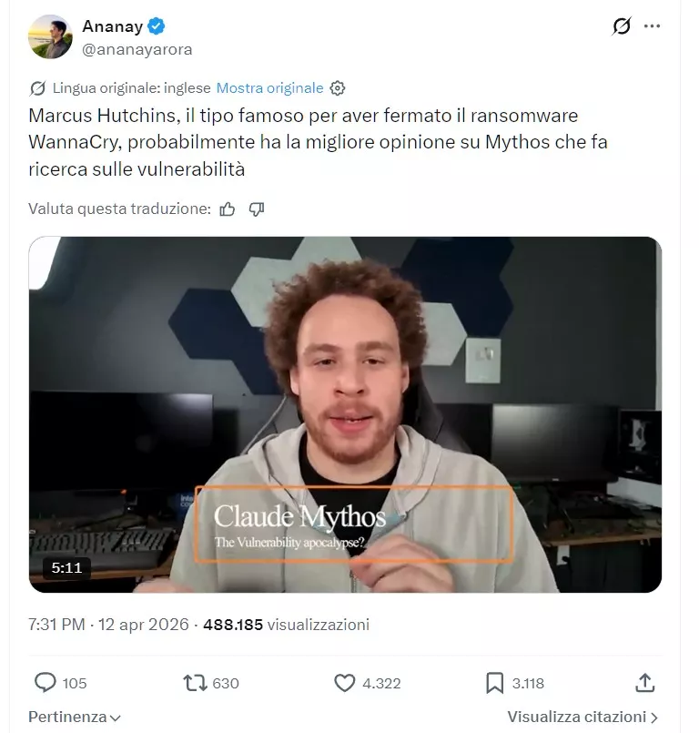 Il modello Mythos di Anthropic sta facendo parlare di se. E' finito al centro di critiche dopo l’analisi di Marcus Hutchins, l’esperto che scoprì il kill switch di wannacry e che molti dei nostri lettori ricordano bene. Si contesta il reale valore delle falle scoperte e i costi dichiarati. Hutchins evidenzia un problema: nella cyber security, le vulnerabilità non mancano per limiti tecnologici, ma per carenza di incentivi, mentre gli attacchi continuano a basarsi sull'ingegneria sociale.