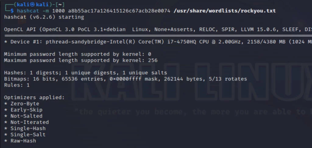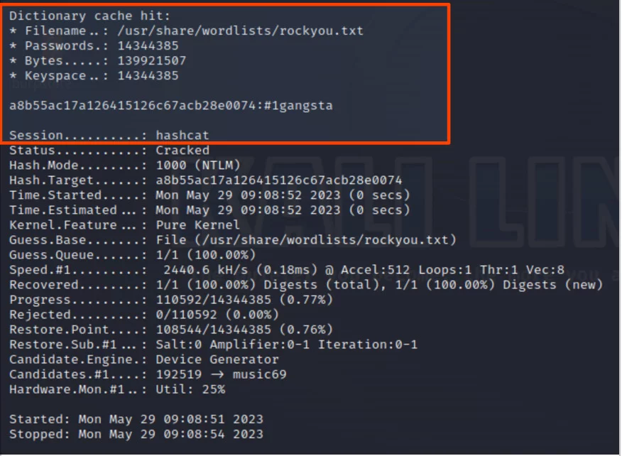 Proviamo quindi a craccare la password dell utente Admin2 con hashcat: