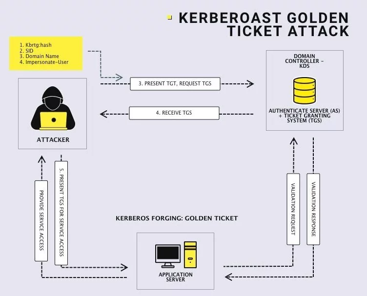Golden Ticket Kerberoast: È un attacco di tipo pass-the-ticket, ma si tratta di un ticket specifico per un account nascosto chiamato KRBTGT, che è l’account che cripta tutti gli altri biglietti. Un Golden Ticket fornisce credenziali di amministrazione del dominio senza scadenza a qualsiasi computer della rete.