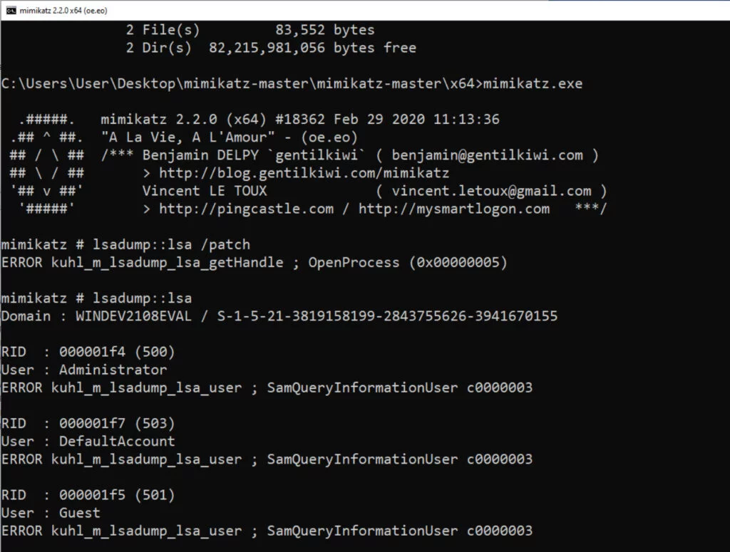 Vediamo subito come impartendo però il comando lsadump::lsapatch /patch su un sistema recente Windows10 non avrá successo come sul sistema Windows Server 2019 (immagine seguente)