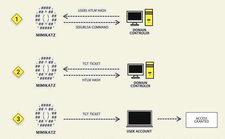 Pass-the-ticket: Le versioni più recenti di Windows memorizzano i dati delle password in un costrutto chiamato ticket. Mimikatz fornisce una funzionalità che consente a un utente di passare un ticket Kerberos a un altro computer e di accedere con il ticket di quell’utente. È molto simile al metodo pass-the-hash.