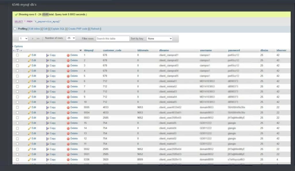 t_payservice_mysql contenente username e password in chiaro di oltre 6.500 istanze;Un dettaglio non trascurabile è la promessa dell’autore: “I will give the phpmyadmin mysql root password”, segno che l’accesso non si limita ai dati ma si estende all’intero sistema di gestione.
