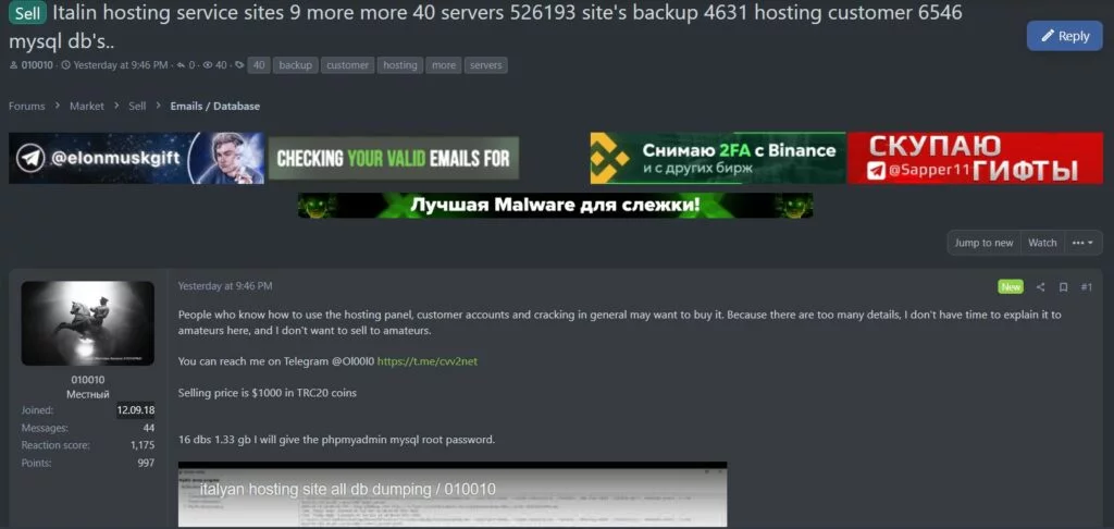 Nelle ultime ore è apparso su un forum underground un nuovo thread dal titolo inequivocabile: “Italin hosting service sites – 9 more 40 servers – 526193 site’s backup – 4631 hosting customer – 6546 MySQL db’s”.