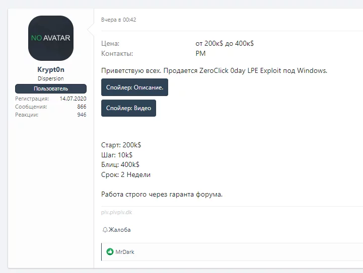 Nella attività di ricognizione delle underground svolte da DarkLab, il gruppo specializzato in Cyber Threat Intelligence(CTI) di Red Hot Cyber, abbiamo rilevato che nella giornata di ieri è apparso su un forum underground russo un annuncio allarmante: un exploit zero-click 0day per Windows, di tipo Local Privilege Escalation (LPE), è in vendita.