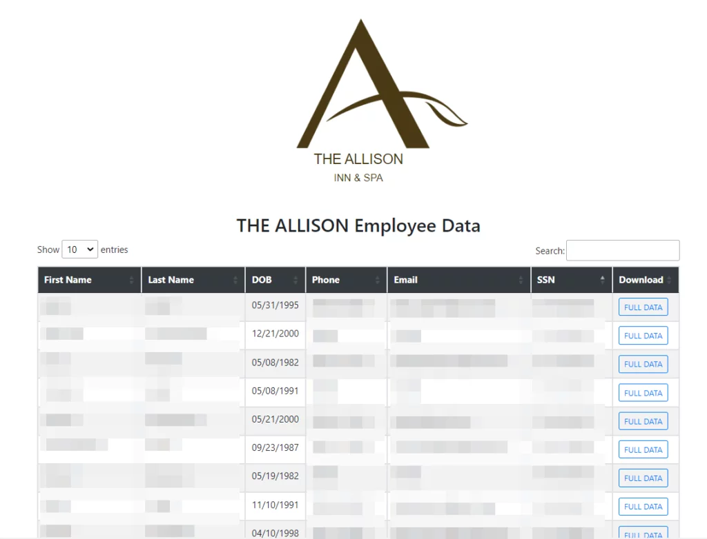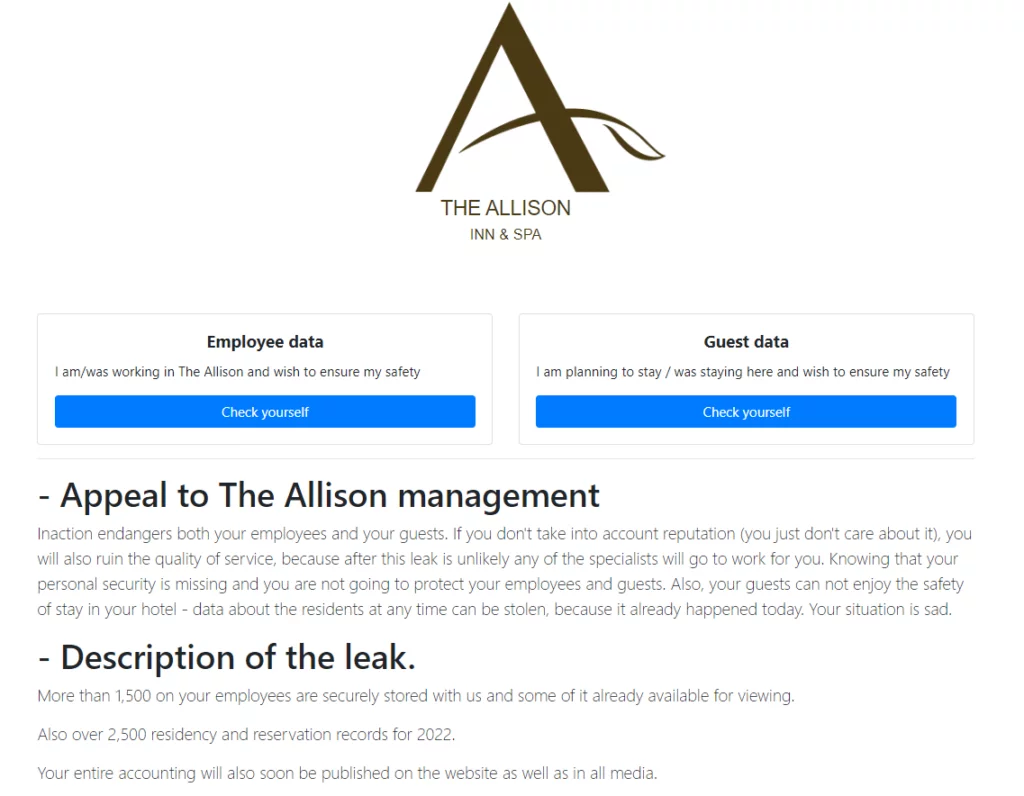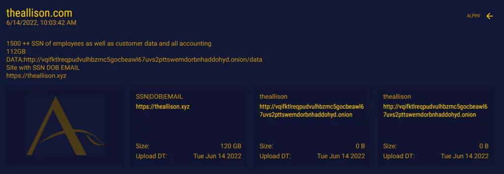 Si tratta nello specifico dell’attacco effettuato da ALPHV/BlackCat a TheAllison[.]com, riportato nel data-leak-site della cybergang ransomware, un resort di lusso americano.