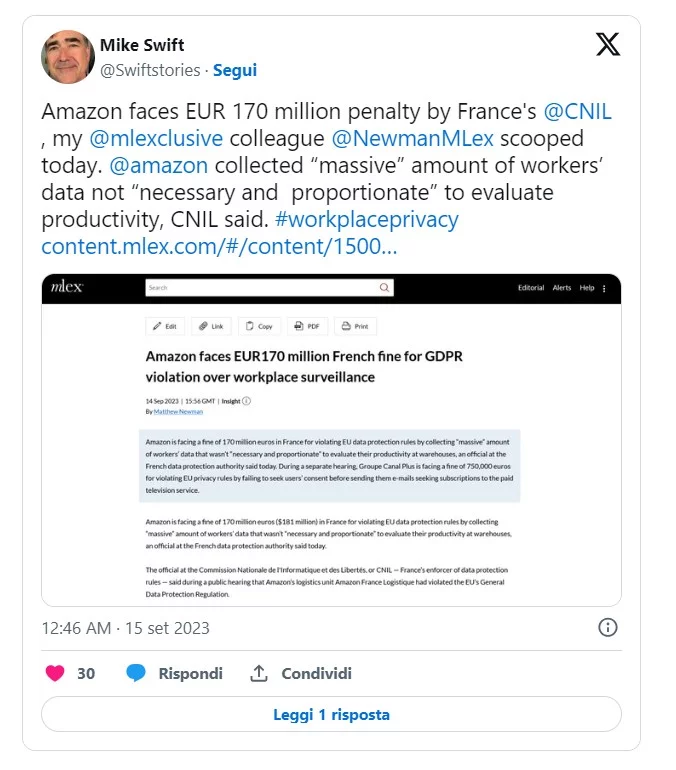 L’autorità di controllo francese, CNIL, sta per avanzare una sanzione da 170 milioni di euro nei confronti di Amazon France Logistic per violazione del GDPR nell’attività di sorveglianza dei dipendenti. Questo è quanto è stato possibile apprendere da una notizia diffusa su LinkedIn, e confermata su X.
