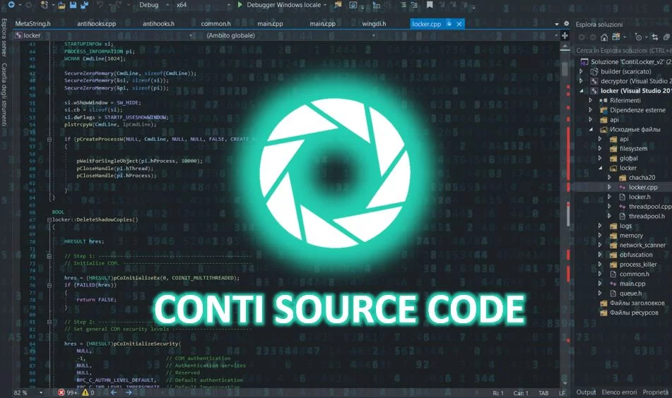 ContiLocker è un ransomware sviluppato dalla Conti Ransomware Gang , un collettivo criminale di lingua russa con sospetti legami con le agenzie di sicurezza russe. Il progetto è sviluppato in C++ su una versione di Visual Studio 2015 con Windows XP Nplatform toolset ( v140_xp ).