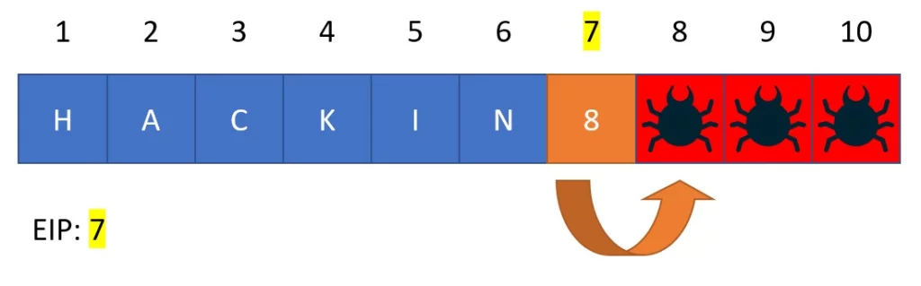 Attraverso questa anomalia un malintenzionato, avendo calcolato quantità esatta di byte che servono per sovrascrivere EIP, può modificare il flusso dell’applicazione, modificando il puntamento di ritorno alla posizione 7 e occupando gli spazi successivi con altro codice dannoso.