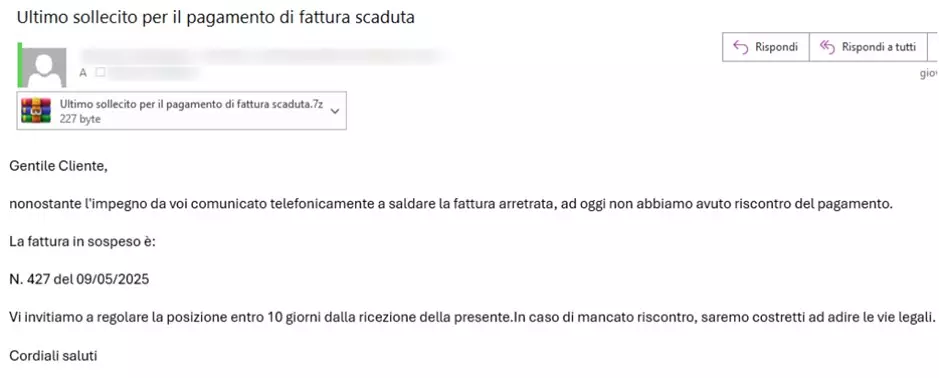 L’attore della minaccia confeziona un’e-mail che appare come una comunicazione legittima e urgente, ad esempio una finta fattura, un documento di spedizione o un preventivo. Il corpo del messaggio è solitamente breve e spinge la vittima a scaricare un allegato o visualizzare un documento esterno tramite un link.
