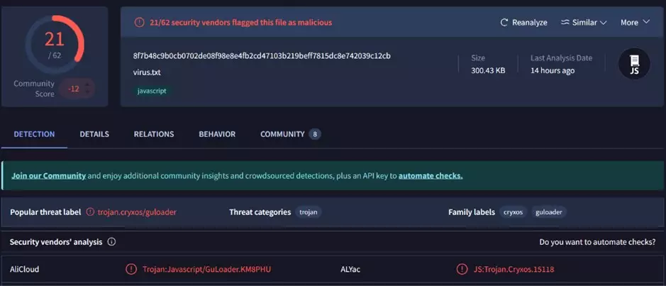 Una volta scaricato ed estratto l’archivio, ci troviamo davanti ad un file di testo con estensione .js. Analizzando l’hash del file tramite i principali motori di TI notiamo che esso risulta segnalato come Trojan.