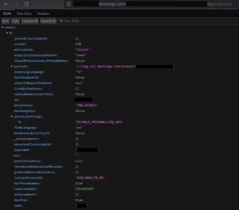 Gli esperti di Vx-underground hanno scoperto che la minaccia proviene da un bug nell’API Duolingo (Application Programming Interface). Questa interfaccia consente agli hacker criminali di raccogliere dati personali con il minimo sforzo inviando una richiesta al sistema con un indirizzo email o un nome di persona.