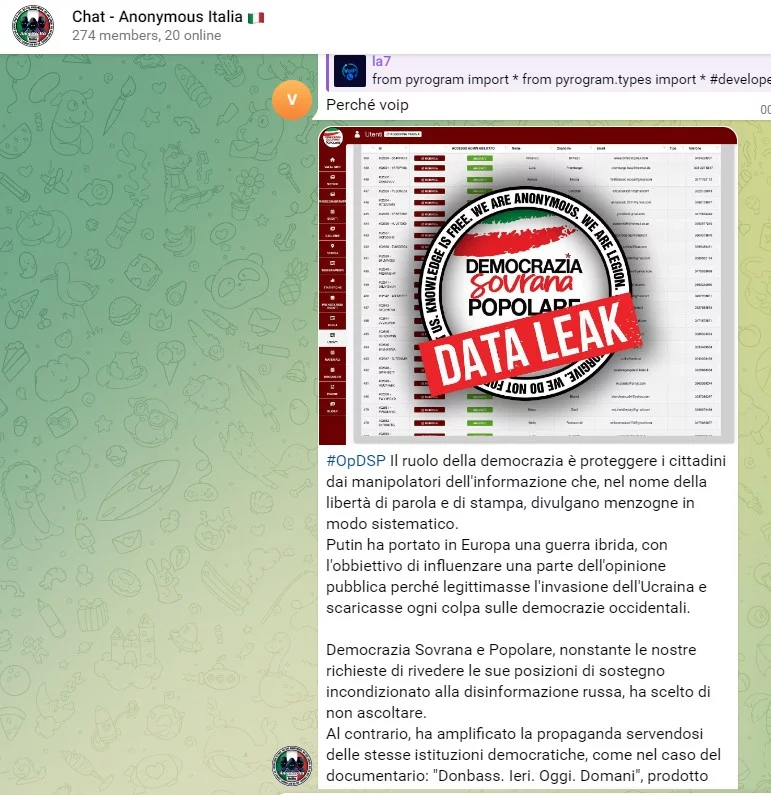 Secondo Anonymous, Democrazia Sovrana e Popolare (DSP) sarebbe coinvolta in queste attività, sostenendo posizioni considerate favorevoli alla disinformazione russa.